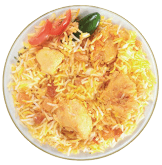 Chicken Biryani: An exquisite festive treat of fragrant Basmati rice and tender chicken breast cooked in a sauce containing a vast array of aromatic, zesty spices and exotic dried fruits. Biryani is the most famous Mughal rice meal in the world.